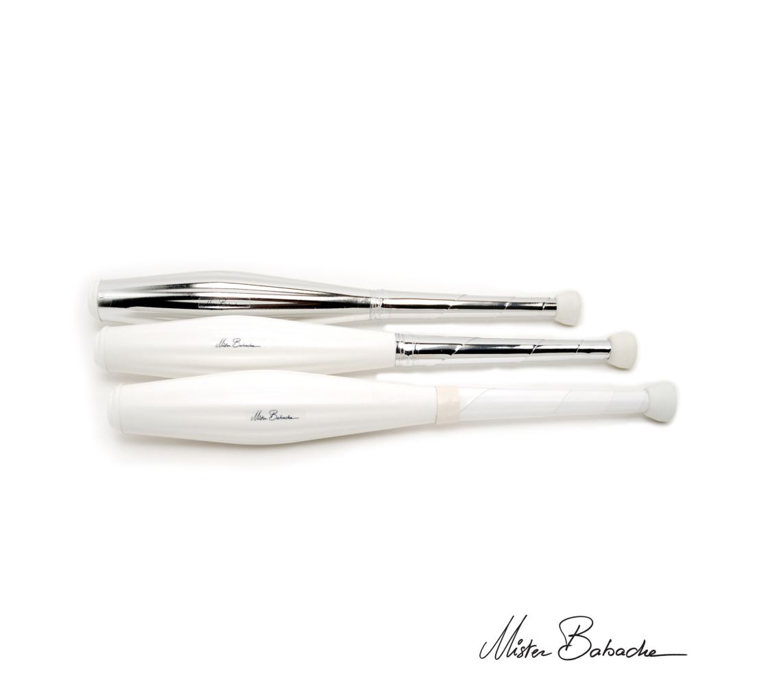 Die Mr. Babache Flash wurde in Zusammenarbeit mit Profi- und Tempojongleur Mario Berousek entwickelt. Sie ist darauf ausgelegt möglichst leicht schnelle Drehungen und hohe Würfe zu ermöglichen. Dafür sind ihr schmaler Body und der kurze, schlanke Griff beste Voraussetzungen. Die geriffelte Form des Bodys und die edle Optik mit silbernem Body, silbernem Griff und weißen Knobs und Tops machen diese Keule außerdem zu einem echten Hingucker auf der Bühne oder beim Training.