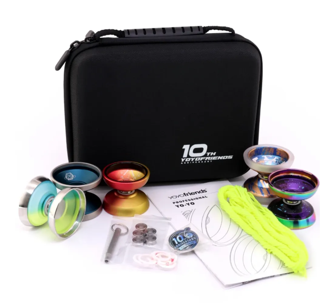 Maak kennis met de yoyofriends Anniversary Kit, een speciale release ter ere van tien jaar toonaangevend design en innovatie. Deze premium collectie bundelt de vijf meest recente anniversary-yo-yo’s, aangevuld met een uitgebreide selectie speciale accessoires, lagers en strings. Alles wordt geleverd in een stijlvolle en gelimiteerde yoyofriends 10th Anniversary bag.